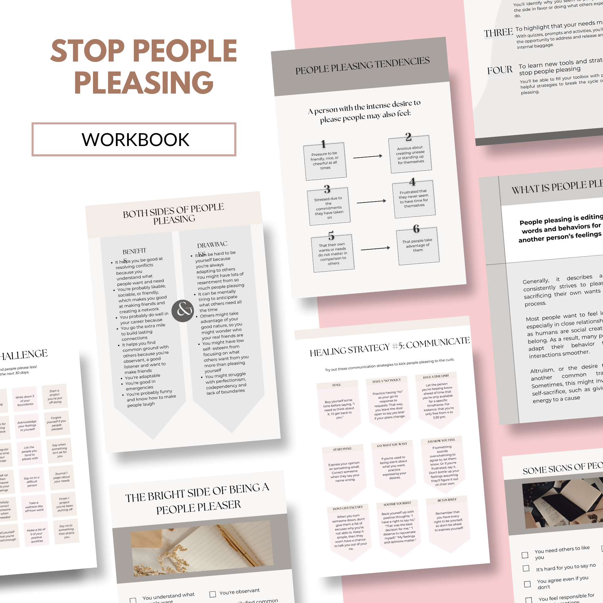 This 44-page workbook identifies signs that you may be people pleasing, negative effects of people pleasing, and causes of people pleasing. The workbook then explores the bright side of being a people pleaser, as well as benefits and drawbacks of people pleasing.